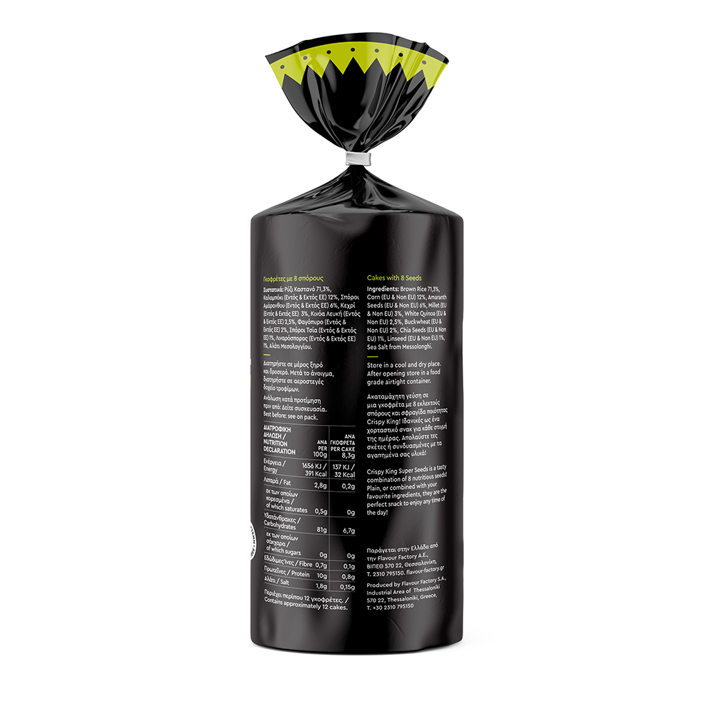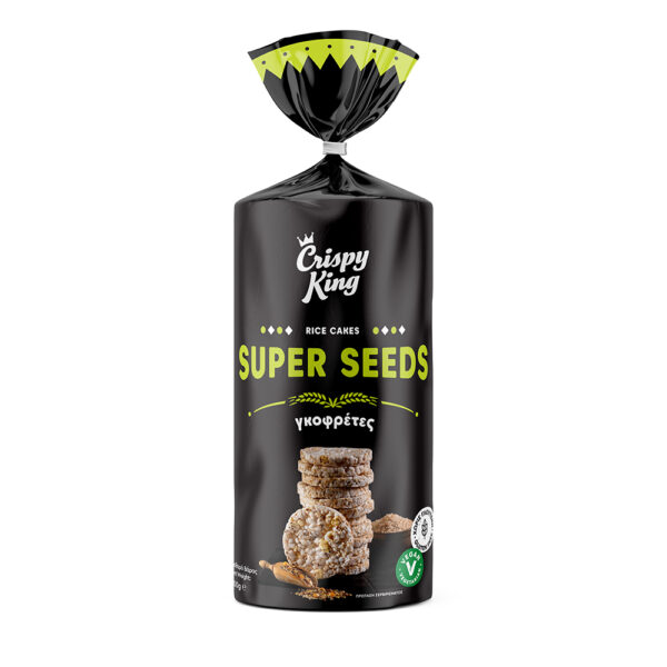 Crispy King Ρυζογκοφρέτες Super Seeds – η απόλυτη θρεπτική επιλογή για όσους αναζητούν ένα υγιεινό, γευστικό και φυσικό snack. Εμπλουτισμένες με 8 εκλεκτούς σπόρους και αλάτι Μεσολογγίου, προσφέρουν πλούσια γεύση, ιδανική υφή και υψηλή θρεπτική αξία σε κάθε μπουκιά.