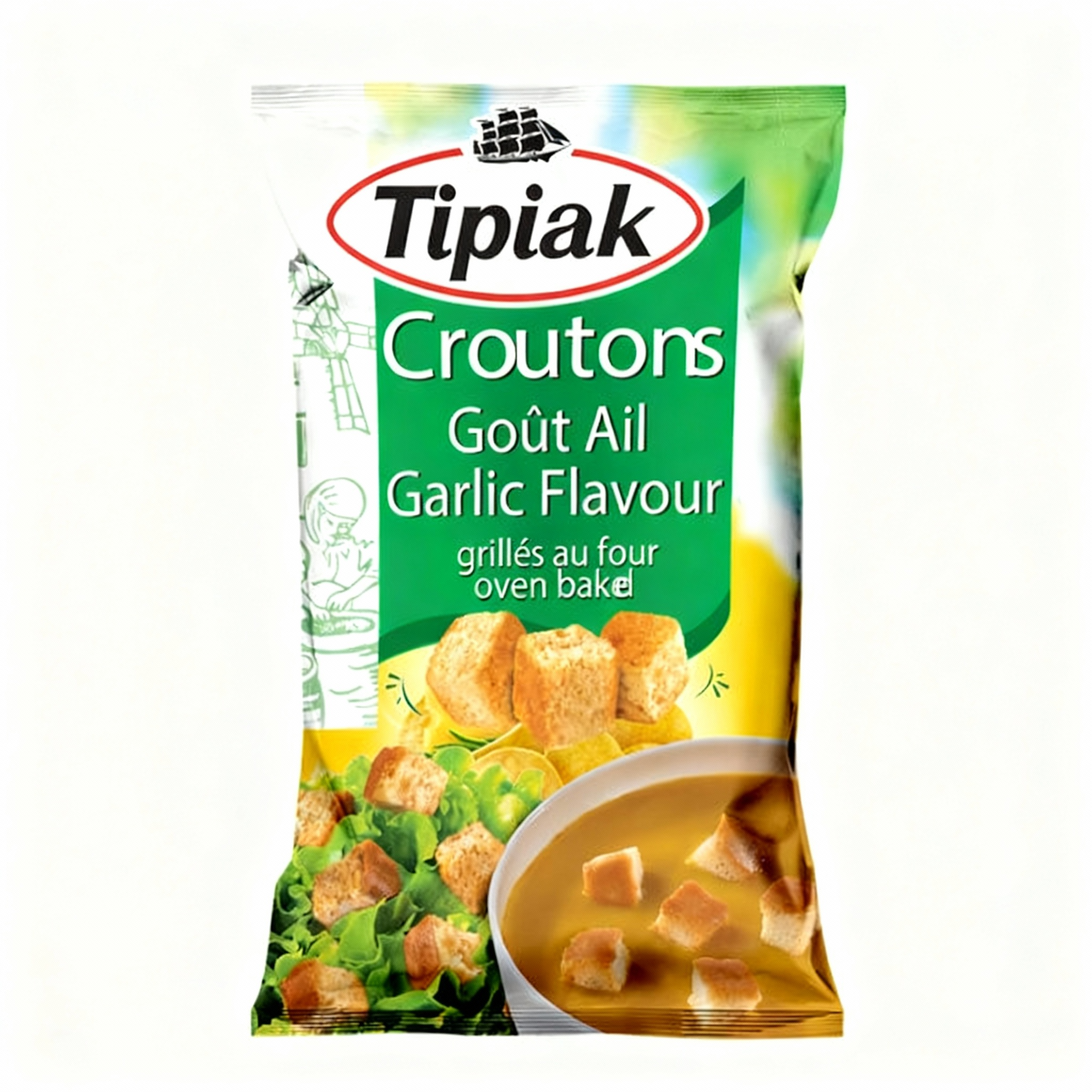 Tipiak Κρουτόν Κύβοι Φουρνιστά με Σκόρδο – η απόλυτη επιλογή για να απογειώσετε κάθε σαλάτα, σούπα ή πιάτο με πλούσια, αρωματική γεύση. Φτιαγμένα με παραδοσιακή γαλλική συνταγή – από τη χώρα που γέννησε τα κρουτόν – προσφέρουν έξτρα τραγανή υφή, τέλεια ισορροπημένη αίσθηση στο στόμα και έντονη γεύση σκόρδου που κάνει κάθε μπουκιά απολαυστική.