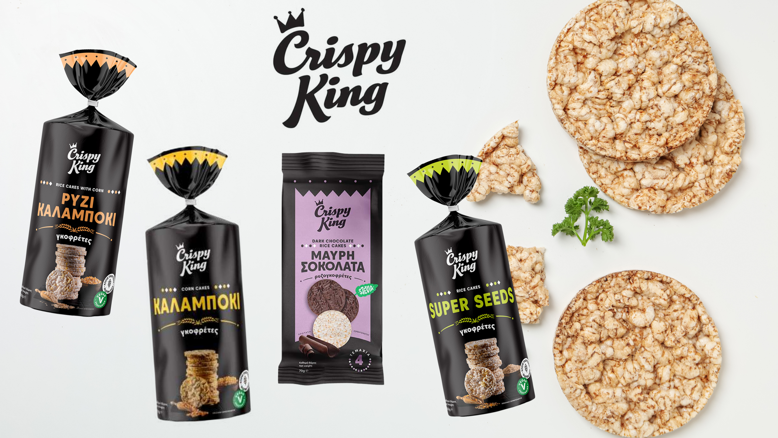 Είναι αφράτη, είναι τραγανή έχει ιδιαίτερη υφή, είναι η ρυζογκοφρέτα της Crispy King σε τέσσερις διαφορετικές γεύσεις. Έχει στρόγγυλο σχήμα με λίγες θερμίδες, λιγότερες από κάθε άλλο σνακ που μπορείς να επιλέξεις για τη καθημερινή σου λιγούρα. Φτιάχνονται από ρύζι σε συνδυασμό με άλλες θρεπτικές ουσίες ανάλογα τη συσκευασία που θα επιλέξεις.